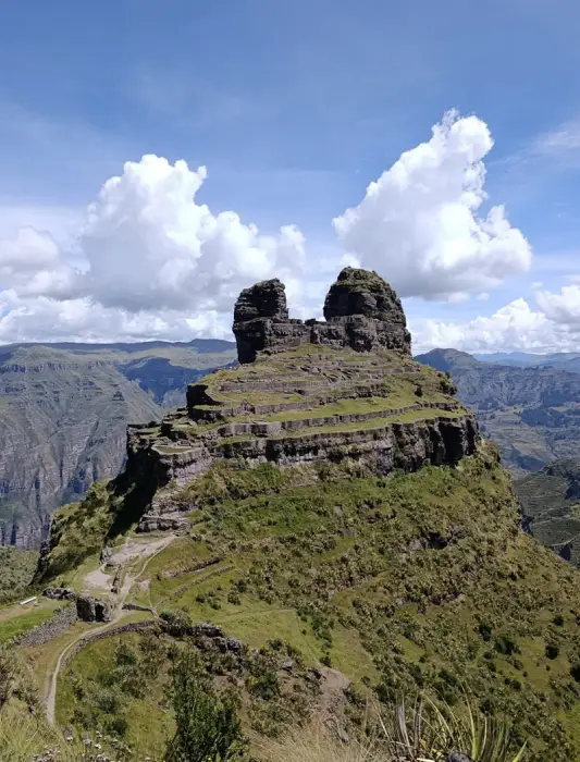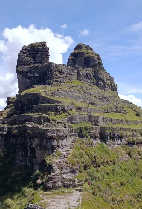 Al llegar al imponente complejo arqueológico de Waqrapukara, situado a más de 4,000 msnm, vivirás un momento inolvidable. Esta antigua fortaleza ceremonial, erigida al borde de un abismo natural, sorprende por su estructura simétrica en forma de cuernos y su ubicación estratégica, rodeada de montañas y silencio. Aquí tendrás tiempo para explorar con calma, tomar fotografías impresionantes y sentir la energía espiritual de un lugar que fue considerado sagrado por los antiguos incas. - 10:30 a.m. – 13:00 p.m. Caminata de retorno